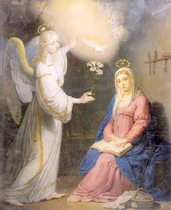 «Ангел, вошед к Ней, сказал: РАДУЙСЯ, Благодатная! Господь с Тобою; благо-словенна Ты между женами. Она же, УВИДЕВШИ его, смутилась от слов его и размышляла, что бы это было за приветствие». (Луки гл.1 ст.28,29) И в этих стихах мы встречаем Ангела, которого Мария УВИДЕЛА и УСЛЫШАЛА, говорящим ей на родном языке приятные слова о РАДОСТИ. Она не падает в обморок, а только смутившись - немного разволновавшись, в ясном сознании РАЗМЫШЛЯЛА. Мы находим, что Мария в это время находилась одна. Можно предположить, что она помолилась и готовилась отдыхать после напряженного дня работы и вдруг входит Ангел. «И сказал Ей Ангел: НЕ БОЙСЯ, Мария, ибо Ты обрела благодать у Бога; И вот, зачнёшь во чреве, и родишь Сына, и наречешь Ему имя: Иисус; Он будет велик и наречётся Сыном Всевышнего; и даст Ему Господь Бог престол Давида, отца Его; И будет ЦАРСТВОВАТЬ, над домом Иакова ВОВЕКИ, и Царству Его не будет конца». (Луки гл.1 ст.30-33)